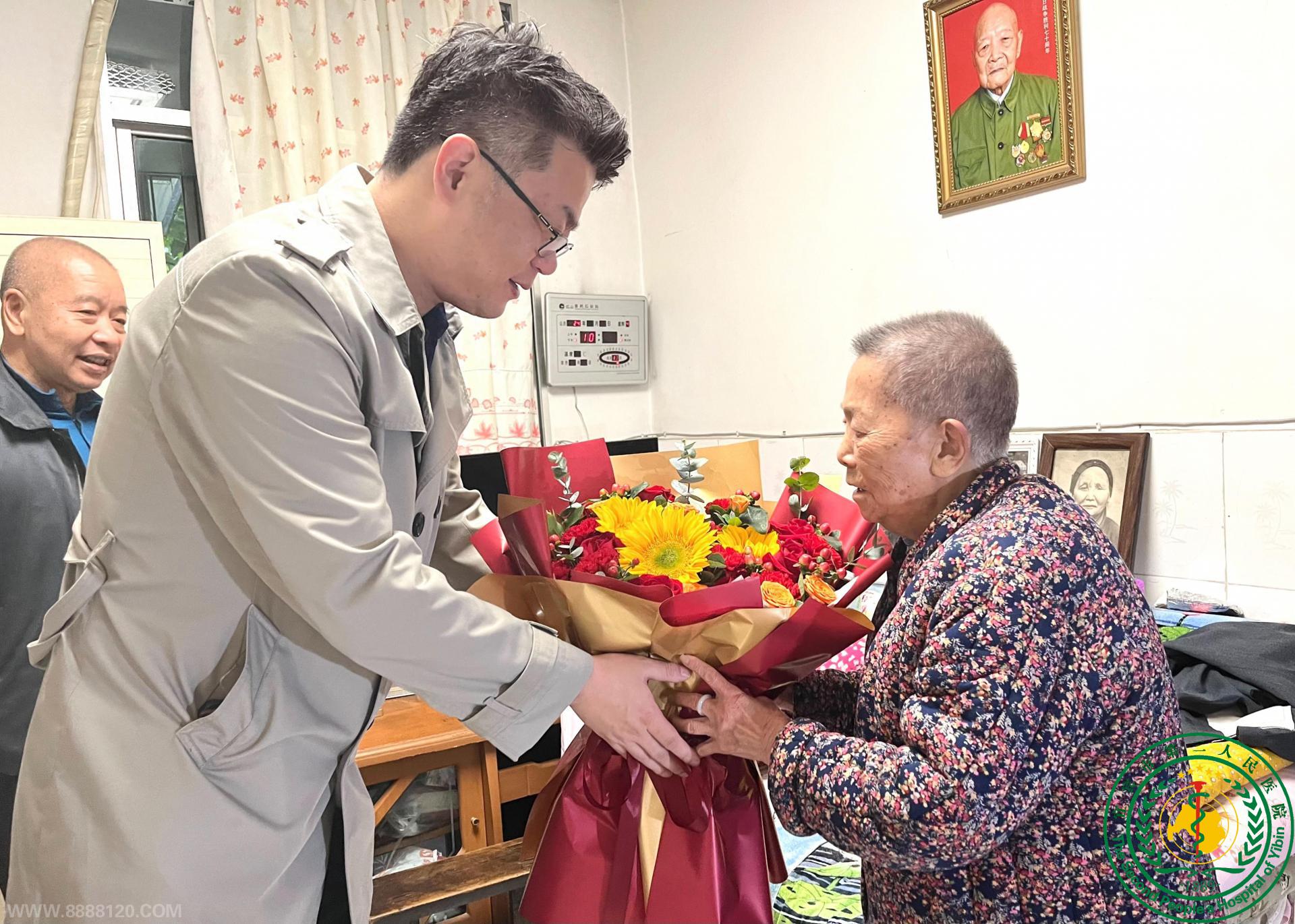 党委书记刘明向退休老党员代表送花