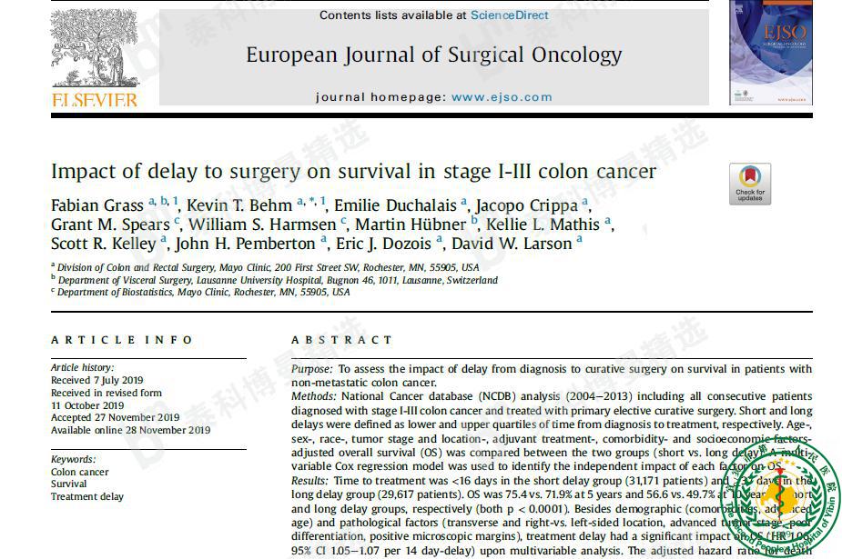 Impact of delay to surgery on survival in stage I-III colon cancer