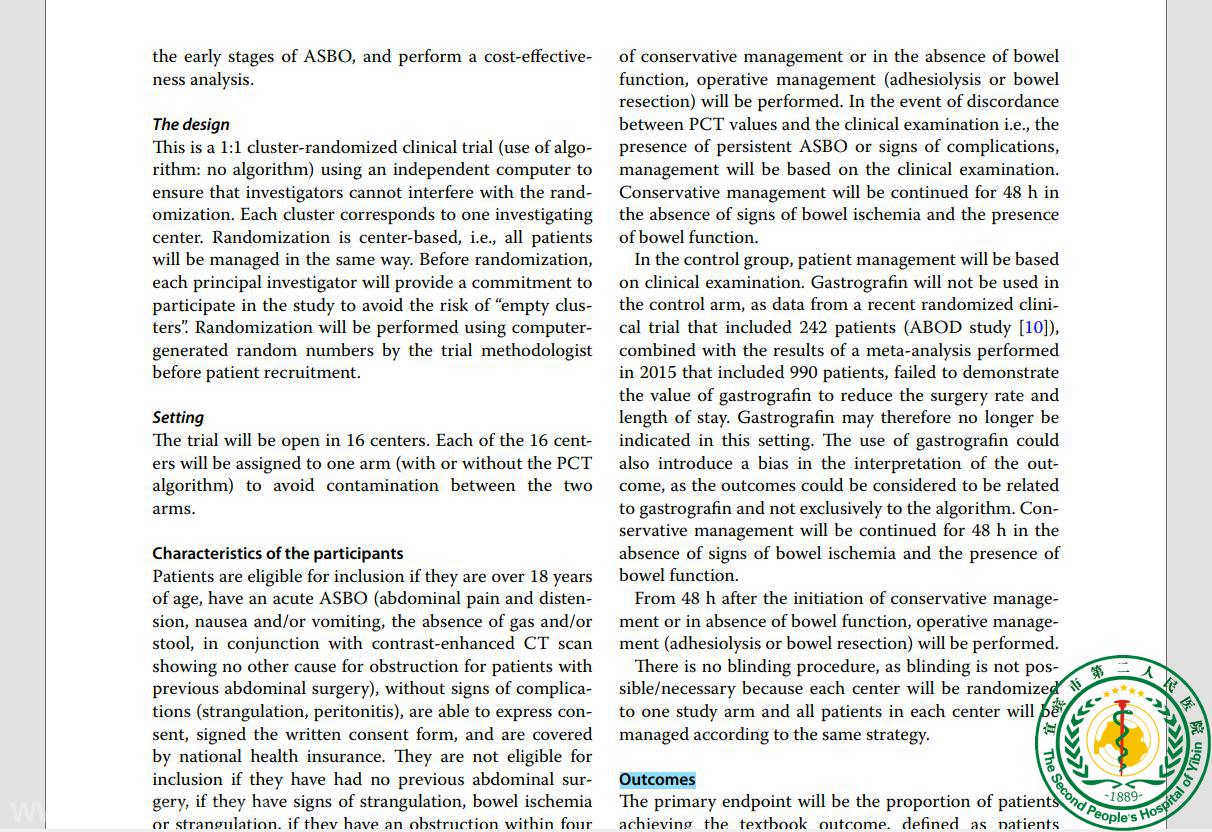 Impact of a procalcitonin-based algorithm on the quality of management of patients with uncomplicated adhesion-related small bowel obstruction assessed by a textbook outcome: a multicenter cluster-randomized open-label controlled trial44341