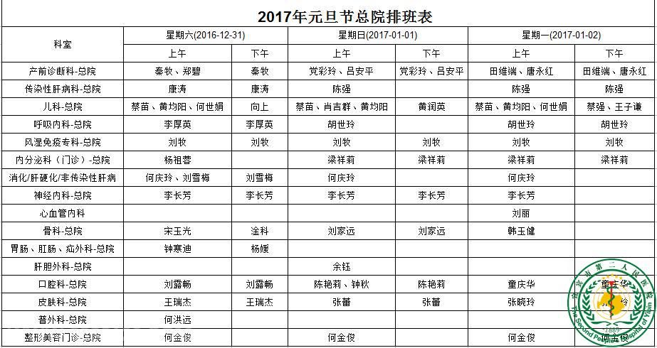 2017年元旦总院门诊排班表