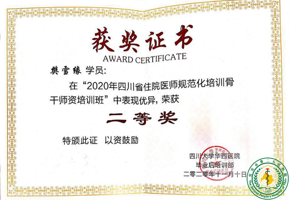 喜讯:核医学科樊雪缘在2020年四川省住院医师规范化培训骨干师资培训班中荣获“二等奖”32705