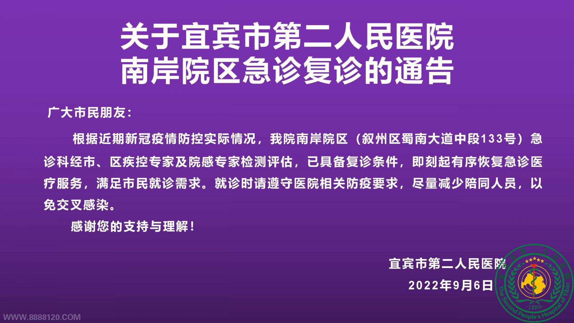 关于宜宾市第二人民医院南岸院区急诊复诊的通告