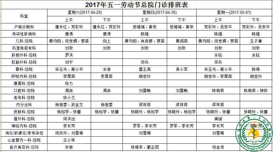 2017年五一劳动节排班表
