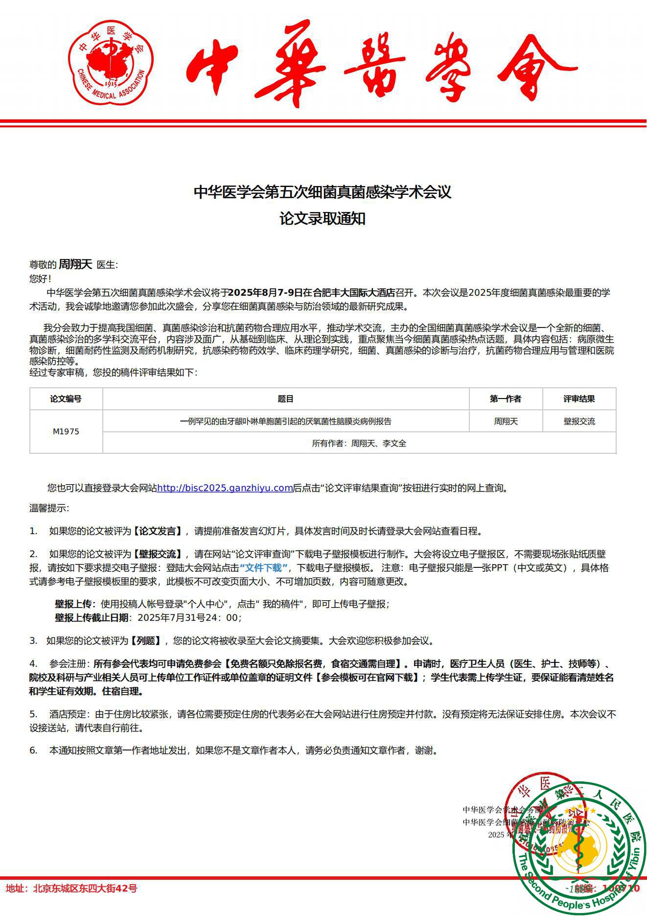 祝贺感染性疾病中心周翔天医生论文被中华医学会第五次细菌真菌感染学术大会录用,并获得大会壁报交流。